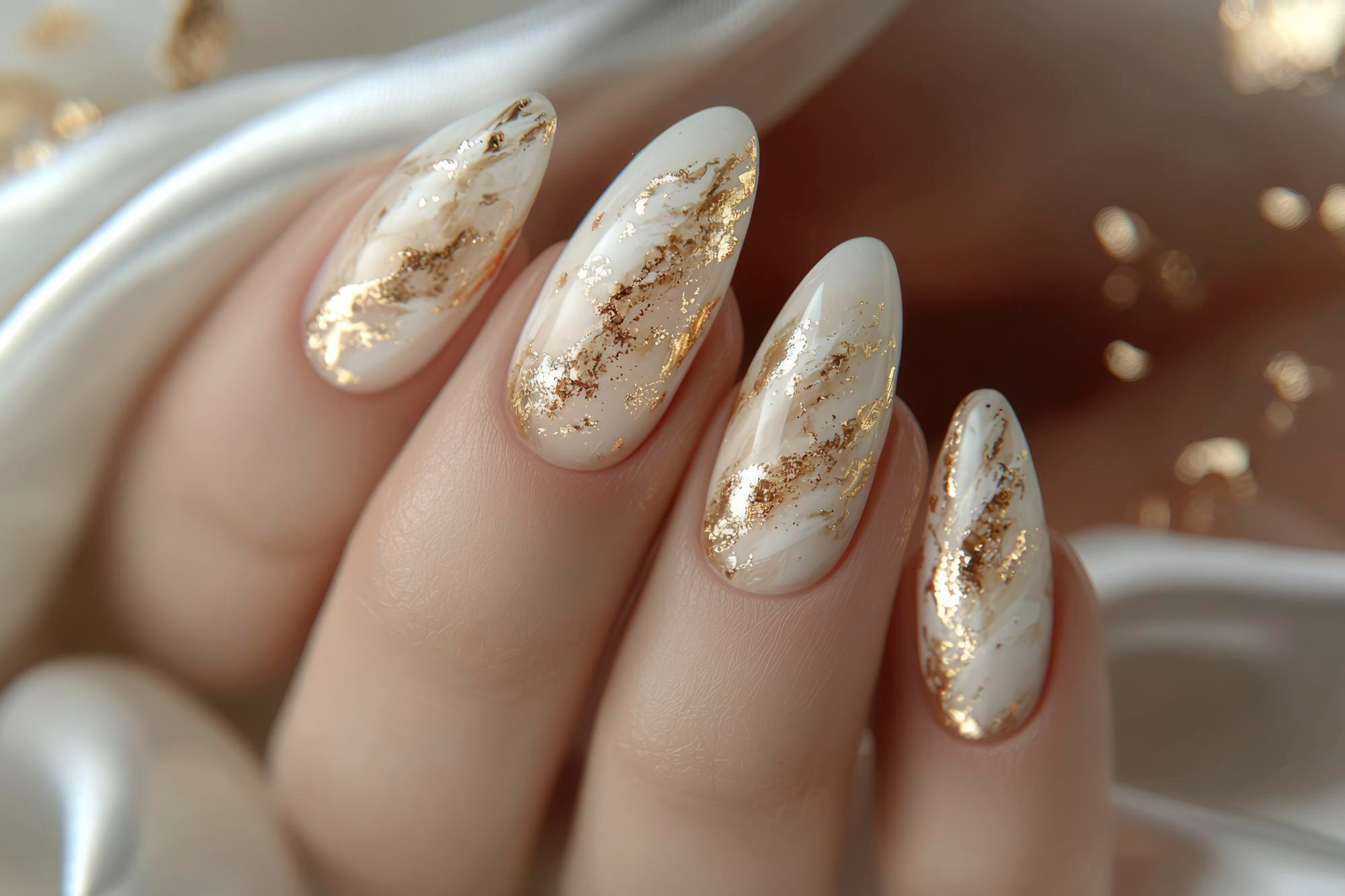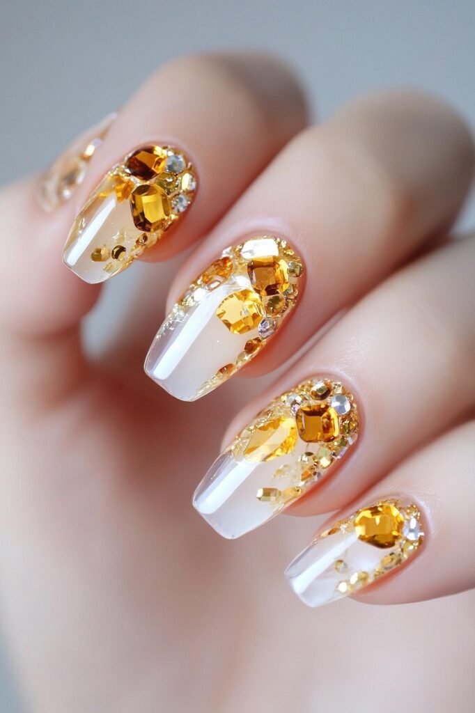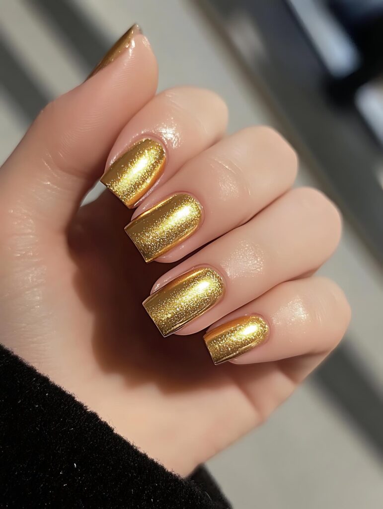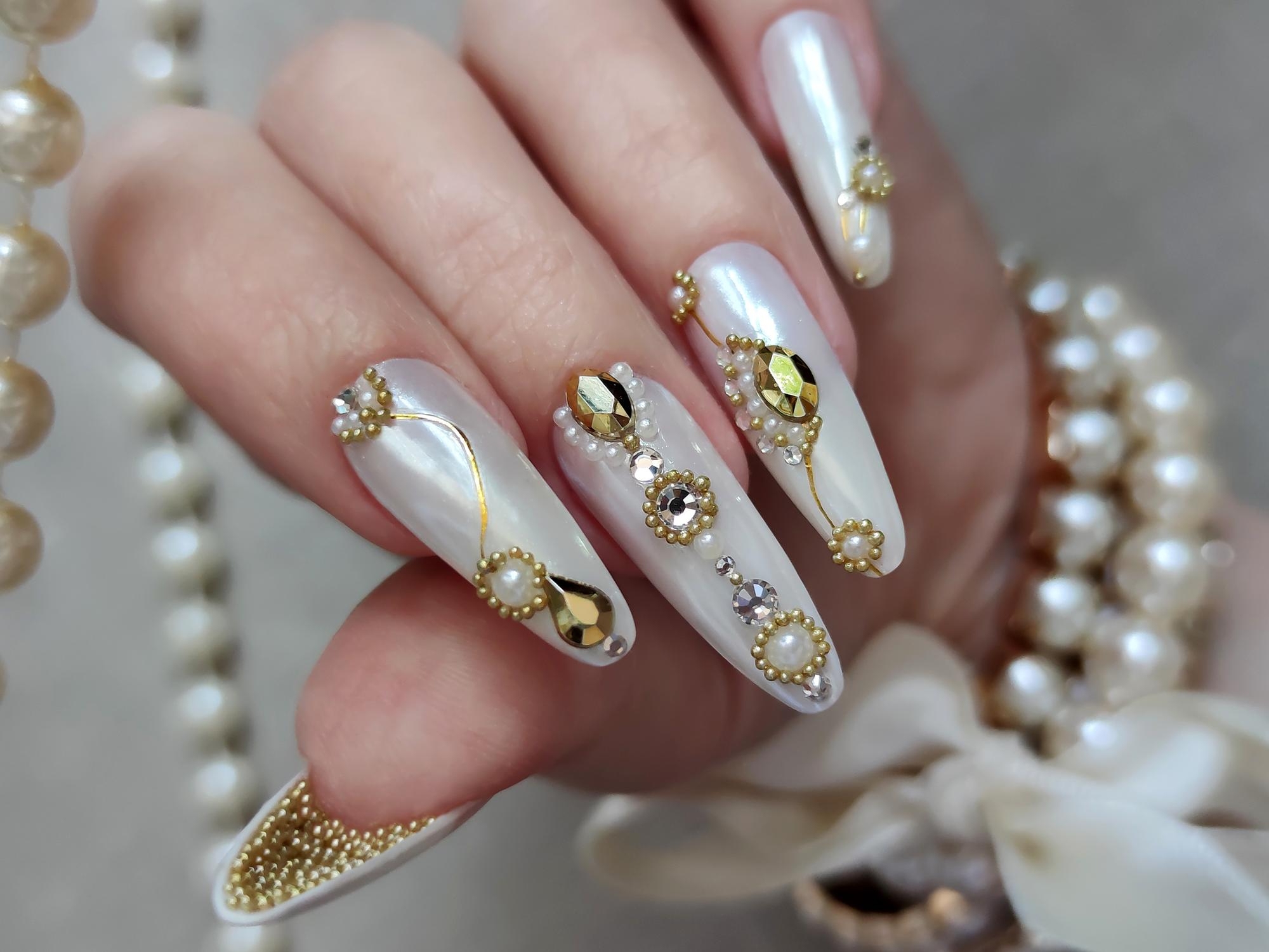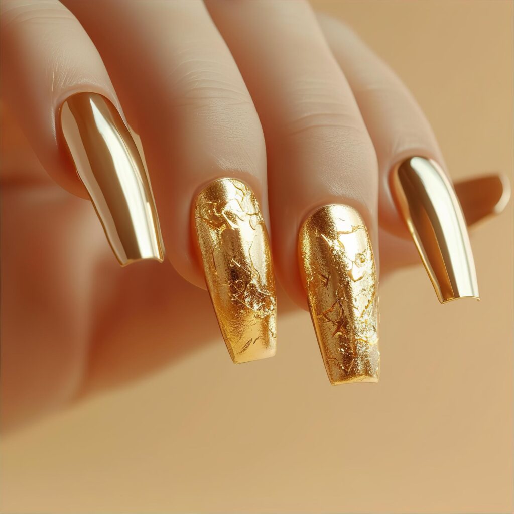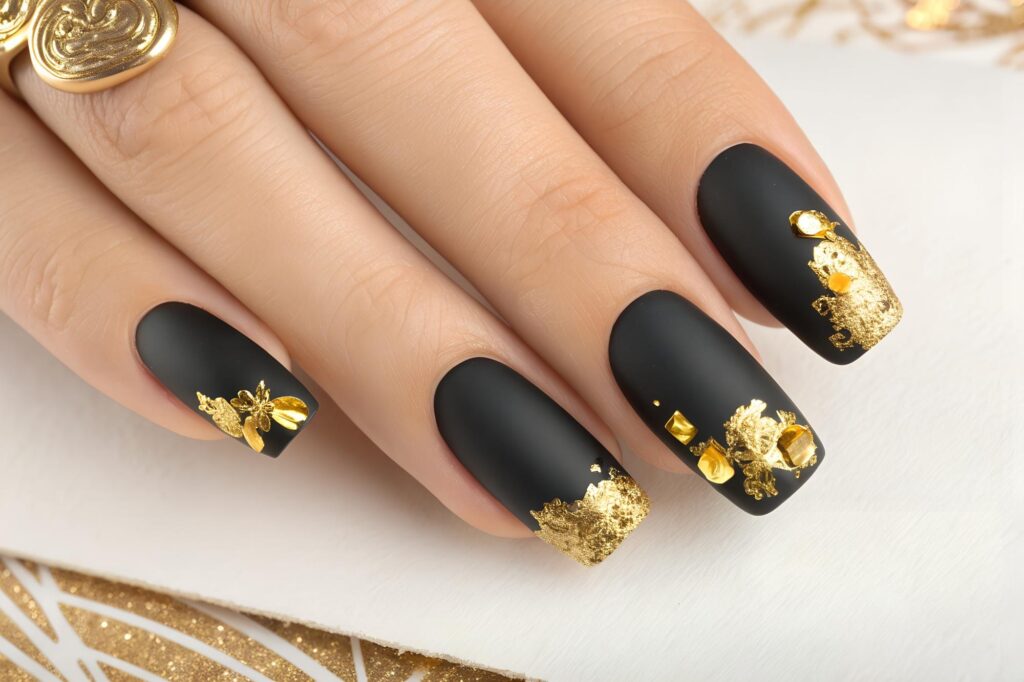 Luxury pedicure with black and gold lacquer on women’s toes on the black and brilliant background.